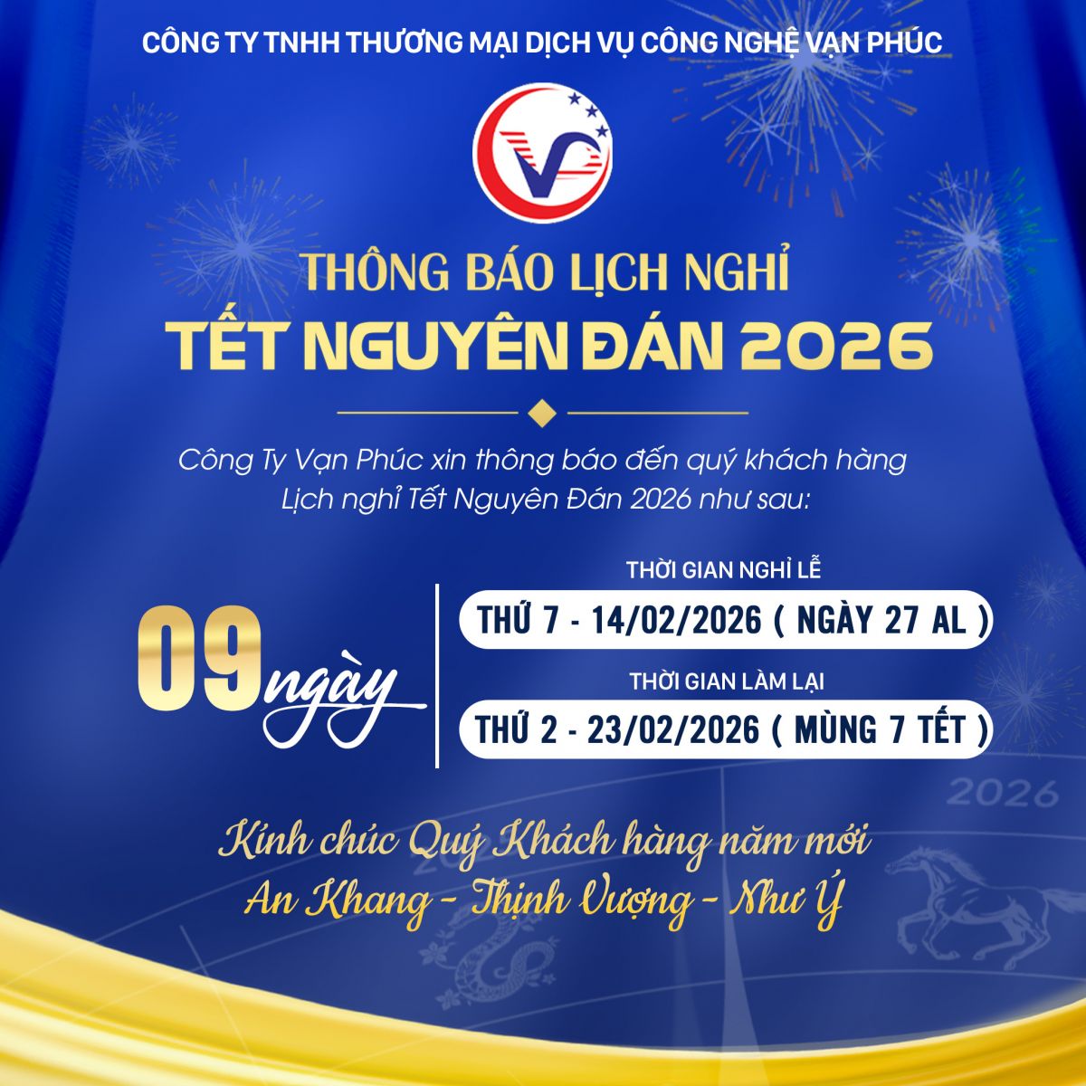 CÔNG TY VẠN PHÚC THÔNG BÁO LỊCH NGHỈ TẾT NGUYÊN ĐÁN 2026